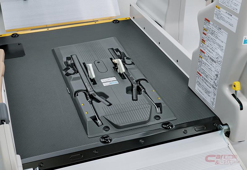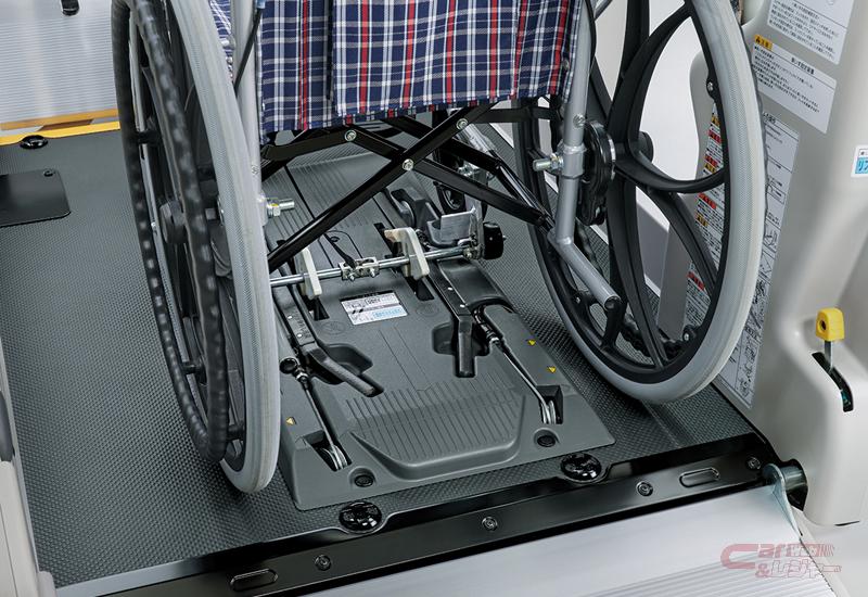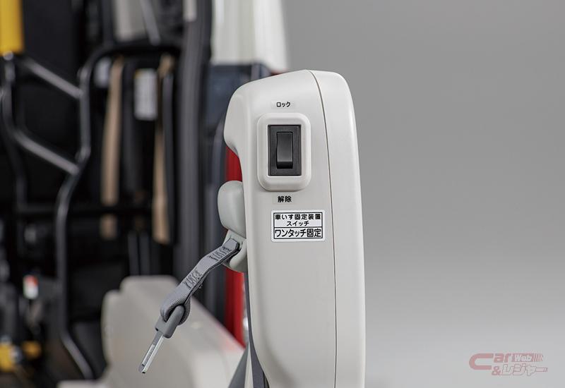 アンカーバー付車いす(日本福祉車輌協会の「車椅子簡易固定標準化コンソーシアム」のガイドライン対応商品)に、スイッチ操作のみで「ワンタッチ固定」できるBUタイプ、FUタイプを新設定することで、車いす固定作業の効率化・迅速化に寄与する。