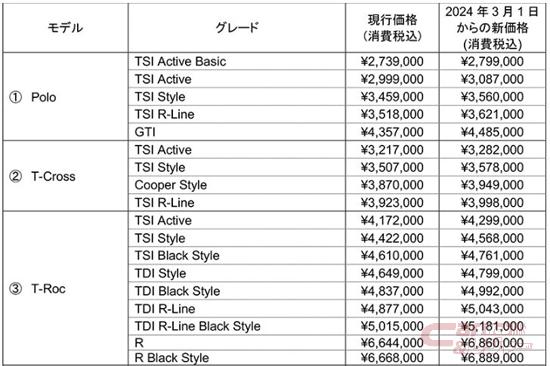 なお、今回の価格変更は原材料費の価格上昇に伴うもので、価格改定幅はポロ、ティーロック、ゴルフ トゥーランで約3%、その他のモデルで約2%となる。