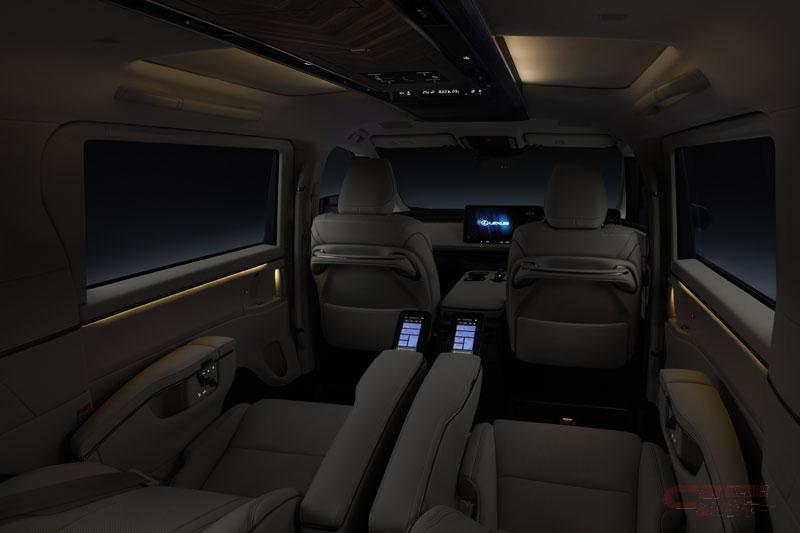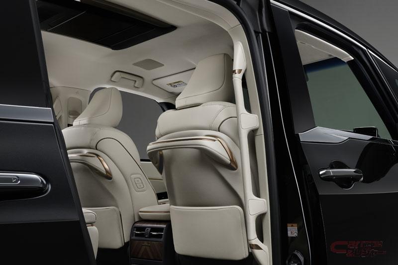 また、ビジネスやプライベートを含む様々な利用シーンを想定し、開放感と見晴らしに配慮しながら、多人数乗車においてもパーソナル感を尊重したリラックスできる室内環境づくりに注力。どのシートでも快適に過ごせるようパッケージングに考慮してシートを配置。2列目シートには左右席それぞれにマルチオペレーションパネルを装備、後席オーバーヘッドコンソールは3列目シートからの使用性にも配慮されている。助手席のヘッドレストは前方可倒、上下調整が可能な他、後席の開放感と見晴らしにも配慮した。インテリアカラーには“ソリスホワイト”と“ブラック”を設定した。
