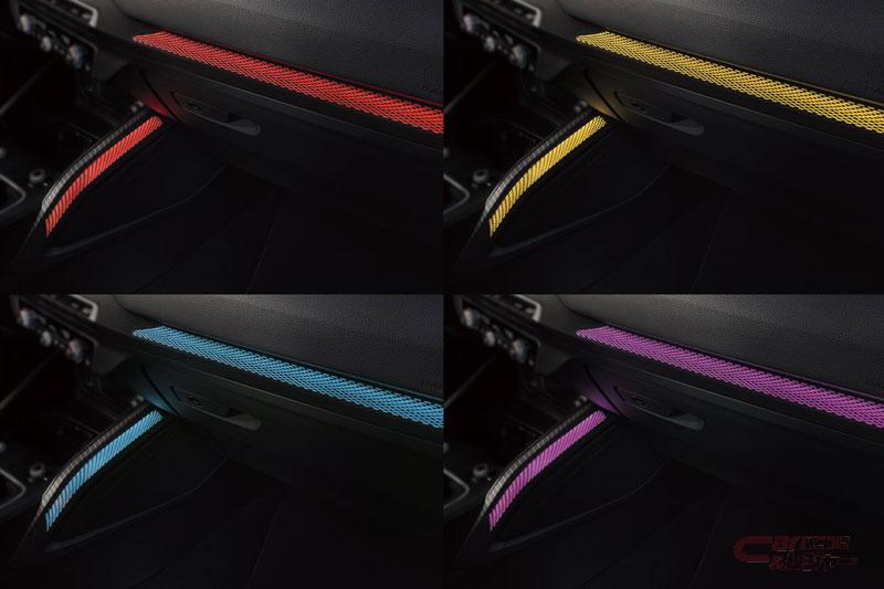 内装では、シートにパーシャルレザー素材を使用し、フロントはシートヒーター付きのスポーツシートを採用。また、マルチカラーアンビエントライティングとそれに対応する専用のライトグラフィックデコラティブパネルにより、独創的かつ上質な室内空間とした。