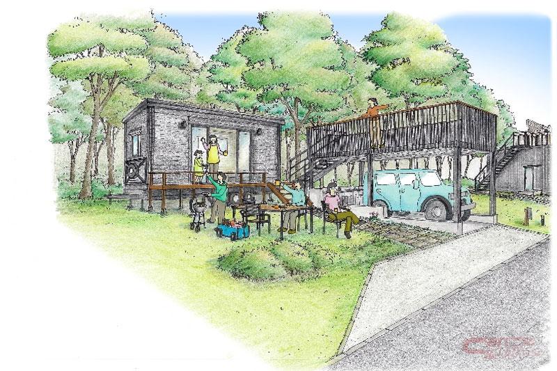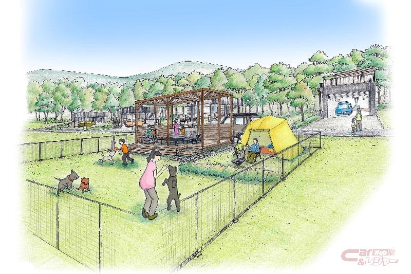 全36サイトで構成される宿泊施設は、電源付きオートキャンプサイトに加え、愛⽝と⼀緒に楽しむことができるドッグランサイトも併設。宿泊棟としてフルリノベーションした1970年製のヴィンテージトレーラー「エアストリーム」横には、観覧デッキとアウトドアダイニングを併設している他、ホテルライクな設備を完備した近未来型トレーラーハウスや、ログトレーラーにコースを⾒渡せる展望テラスを備えたサイトの設置も予定。