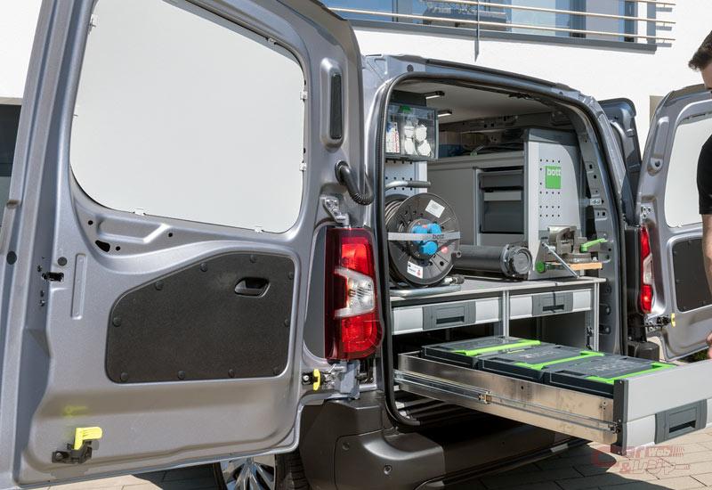 室内空間では、どんな車にもぴったりの棚を取り付けて細かい部品や工具をきれいに便利に収納できる、働くクルマの製作に便利な、アルミ製の車載用キャビネットシステム「bott」と、ぬくもりを感じる「木材家具」をバランスよく調和。