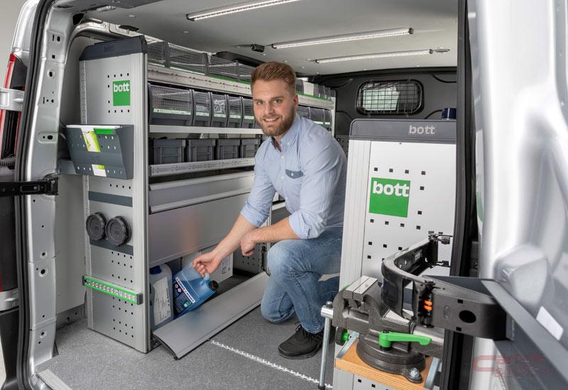 またbott 製品は、UNECE規則R44に基づいた厳しい強度試験や衝突安全テストをクリアし、ドライバーの安全を第一に考え、万が一の事故でも荷物や工具の飛散を最小限に抑える設計となっており、積載した収納ボックスではキャビネットに戻すと自動ロックされるため運転時にも飛び出すことがなく安全に使用できる。