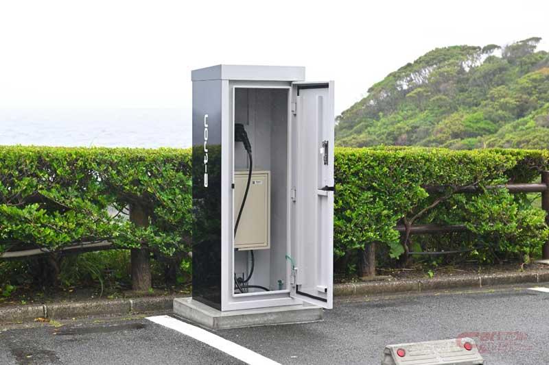 同ボックスには、塩害を防ぐ強力な特殊塗料を塗布しており、潮風の塩分から充電器を守る他、海岸沿いに吹く強い風にも耐えられるよう、充電器をアンカーボルトで強固に固定している一方、充電の利便性を損なわないよう、ボックス中央部に開口部を設けて充電ケーブルを通し、ボックスの扉を閉めたままでの充電も可能となっている。