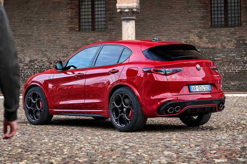 外装では、アルファ ロメオを象徴する縦型フロントグリルのVシールドを採用し、フルLEDマトリクスヘッドライトを新装備。また、専用フロントバンパーやエアベントのデザインや、新たにクリアレンズ化されたシンボリックなフォルムのブラックテールランプ等がクアドリフォリオの伝統的なスポーティさを強調。足元にはレッド仕上げのブレーキキャリパーを備えた19インチアルミホイールを装着した。