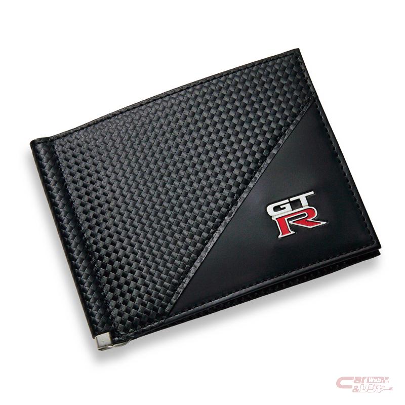 - GT-Rマネークリップウォレット:カーボン調レザーにGT-Rメタルロゴが輝くマネークリップ。バネ式のクリップに加え、カード入れが6カ所付いており、収納力がありながらスリムなデザイン。