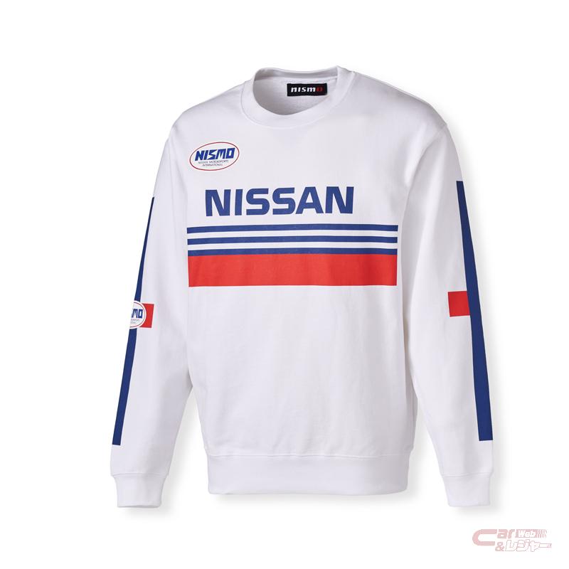 - HERITAGE ワークススーツデザイントレーナー:日産ワークストリコロールカラーのスウェットトレーナー。背面にNISSANの旧ロゴが入っており、グループC耐久レースで活躍したかつてのレーシングスーツを思わせるデザインを採用。