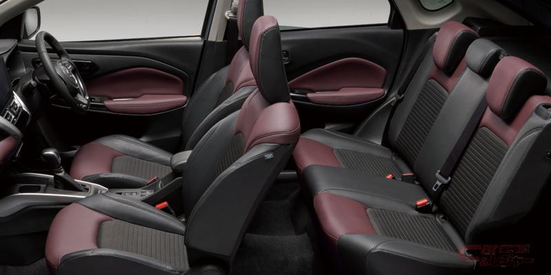 内装では、ブラック×ボルドーの配色と高輝度シルバー塗装の加飾により、スポーティーで高級感がありながらSUVの力強さを演出。エアコンサイドルーバーガーニッシュやインサイドドアハンドルガーニッシュにパールブラック塗装を施すことで洗練さを表現した他、シルバーステッチを施したレザー調&ファブリックシート表皮やレザー調ドアアームレスト表皮の採用等により心地良さと上質感を演出。