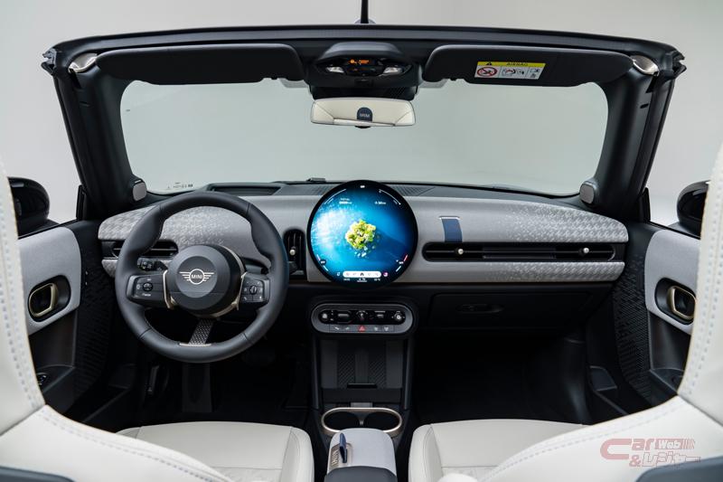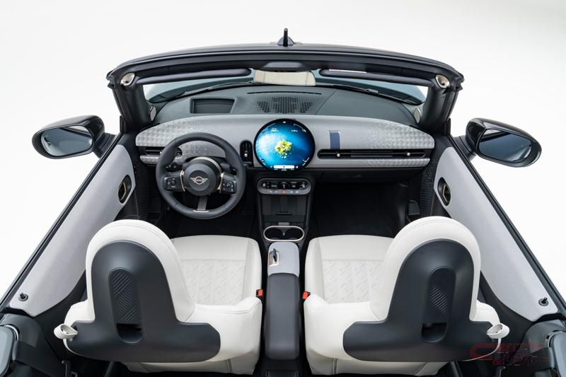 新型ミニ・クーパー・コンバーチブルは、「”LESS IS MORE” より少なく、より豊かに」のデザイン・アプローチを体現し、削減を何度も繰り返したなめらかなライン、クリーンなサーフェス、バランスの取れたプロポーションを実現。さらに、素材からクローム・パーツやレザーを排除し、代わりに採用した新素材にはリサイクル・ポリエステルやリサイクル・アルミニウムを利用する等、将来を見据えた新世代モデルであることを印象付けている。