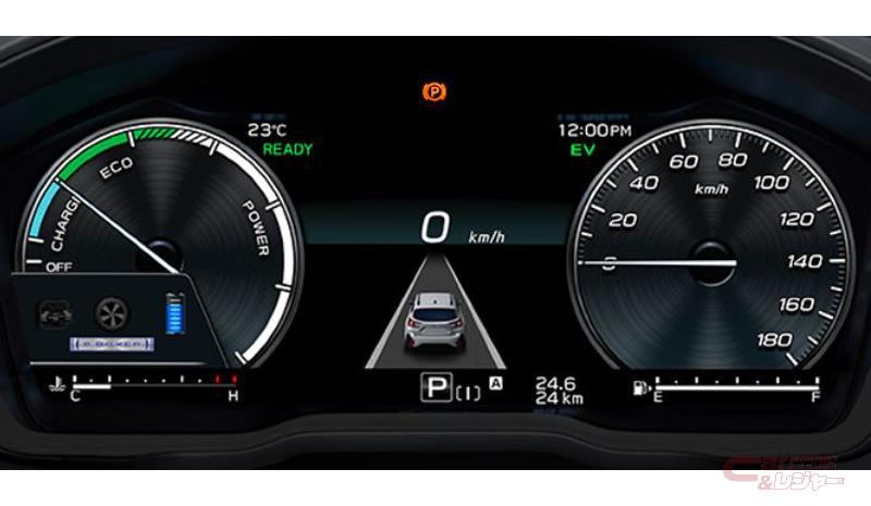 クロストレック(ストロングハイブリッド搭載モデル)は、ストロングハイブリッド専用装備と運転支援システム「アイサイトX」(渋滞時ハンズオフアシスト、渋滞時シススト、カーブ前速度制御、料金所前速度制御、アクティブレーンチェンジアシスト)を搭載。内装では、ブラック×グレーカラーを採用することで洗練さと上質感を演出。また、システム状況を表示するストロングハイブリッド用12.3インチフル液晶メーターを装備した。