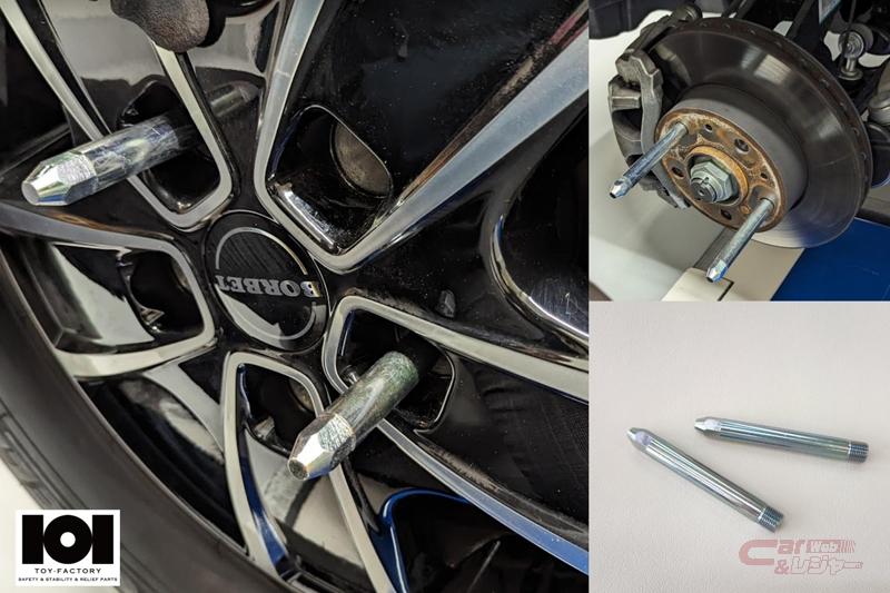 輸入車は国産車と異なり、ハブからボルトが飛び出していないためタイヤ交換時にホイールが安定せず、ホイールボルトを差し込む作業が大変となる。101T-SR ホイールガイドバーをハブ穴に固定することで、大きくて重いホイールを簡単に安定保持させることができ、ホイールボルトの差し込みが楽になる。