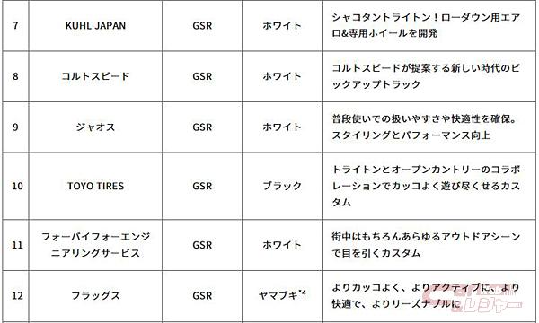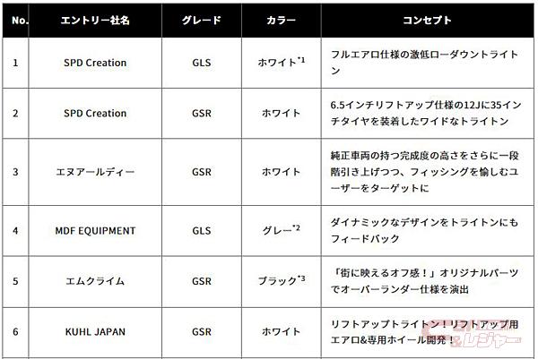 - 竹岡圭賞:「トライトン」でラリーに参戦する、モータージャーナリスト&タレントの竹岡 圭さんが審査員として、最も遊び尽くしたと評価したカスタムカー1台を選出。