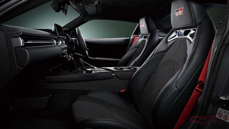 - ドライバーシートにはGRロゴ刺繡を施したアルカンターラ®+本革シート表皮を使用。シフトノブのリングおよびステッチ(6速マニュアルのみ)、シートベルトに赤色を採用しスポーティーさを強調した。