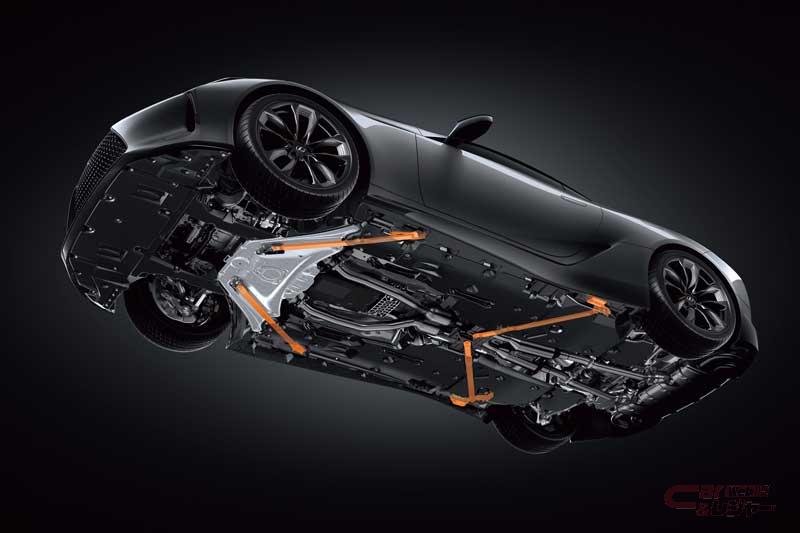今回の一部改良では、Always Onの考え方のもとトヨタテクニカルセンター下山で走り込みを行い、LCの開発コンセプトである“より鋭く、より優雅に”をさらに追求。具体的には、LC500のフロントとリヤに床下ブレースを採用。より高いボディねじり剛性を確保することで、すぐれた操縦安定性と、ドライバーのステアリング操作にクルマが素直に応える車両応答性を高次元で両立。