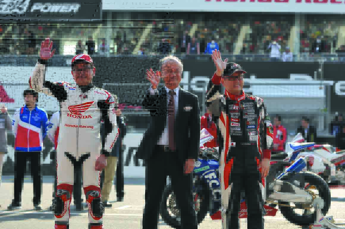 さらにファンを驚かせたのがセレモニー。スーパーGTやスーパーフォーミュラ、ルマン24時間、インディ500など国内外で活躍するトヨタとホンダのマシンが勢揃いしてパレード走行する中、トヨタの豊田章男社長がヤリスWRCで、ホンダの八郷隆弘社長がルマン24時間(二輪)の優勝マシンCBR1000RRで登場。まさかのサプライズにスタンドからは多くの声援が贈られた。