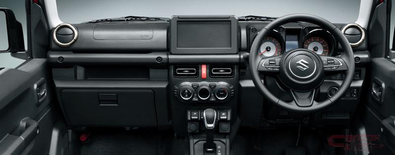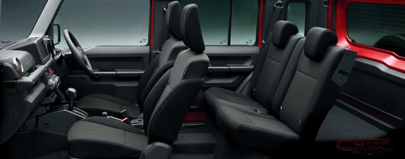 内装では、ジムニーシリーズの特長であるオフロードなど過酷な環境下での運転のしやすさや各部の操作性にこだわった、機能に徹したデザインを継承。後席にしっかりと乗員が座れるようにシートに厚みを持たせ、ラゲッジは荷物の滑りにくいカーペットを採用した他、リヤウインドウ周りにトリムを追加することで、後席乗員の快適性を向上。フロントコンソールボックスにドライバー用の後席パワーウインドウスイッチを追加した。
