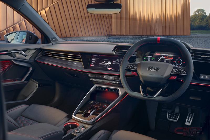 内装では、ファイナッパレザーのスポーツシートや、上下をフラットとしたダブルフラットシェイプデザインのステアリングホイール、RSモードに素早く切り替え可能なサテライトスイッチ、RS専用ディスプレイモードを備えたアウディ バーチャルコックピットプラスなどにより、スポーティさとプレミアム性を併せ持つ室内空間とした。