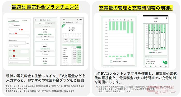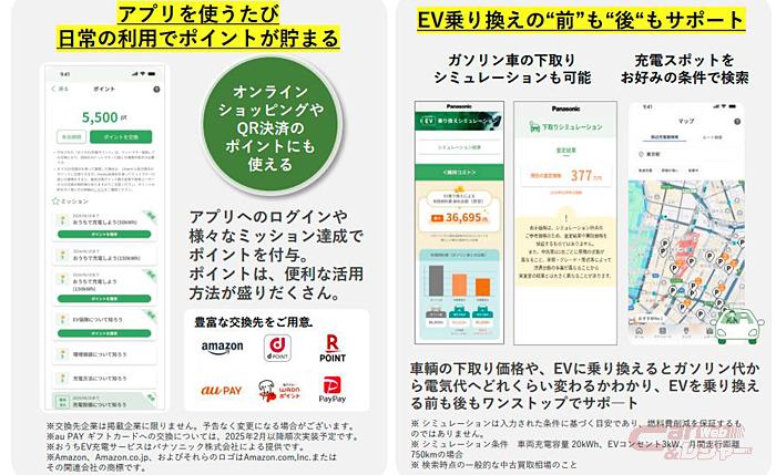 パナソニックの自社調べでは、戸建てEVユーザーの97%(2024年9月)が自宅で充電器を設置しているという結果を得ており、同社は、自宅の充電インフラ整備と電気代の負担軽減の実現が、日本のEV普及に貢献する取り組みになるとの考えから、2030年迄に100万DLを目標に、スマホアプリとIoT EVコンセントを使用し、ユーザーに最適な電気料金プランの提案と電気料金が割安な時間帯に電気を使用するオフピーク充電が可能となる「おうちEV充電サービス」の展開を開始した。