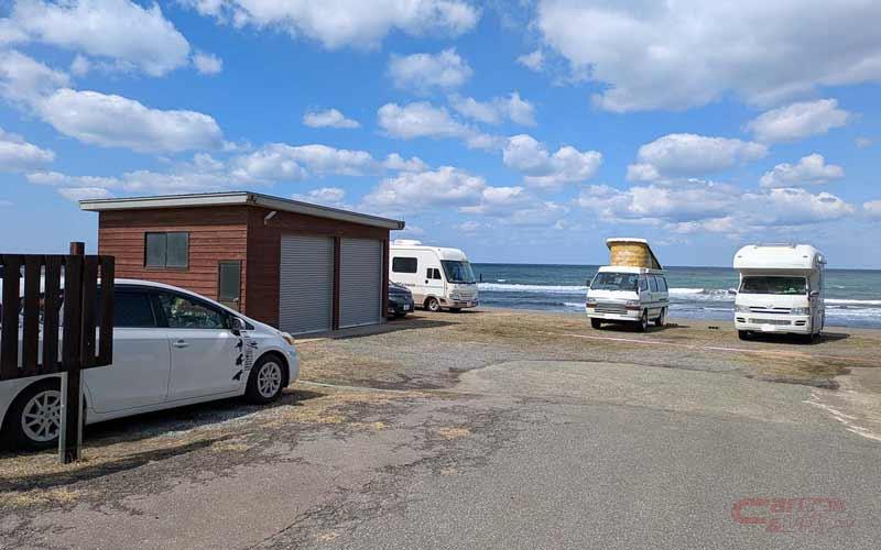 さらに、すぐ近くには食堂や鮮魚店もあり、 温泉、スーパー、コンビニ、海水浴場、釣りができる防波堤なども車で5〜7分圏内と周辺レジャーも堪能できる車中泊スポットだ。