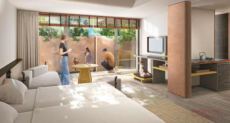 ホテルには多様な客室を備える計画で、一部の客室には愛犬と一緒に宿泊できる部屋の設置を計画。施設内には、愛犬と一緒に食事ができるテラスやドッグ関連の店舗を整備するなど、エリア全体でドッグフレンドリーな環境を目指している。