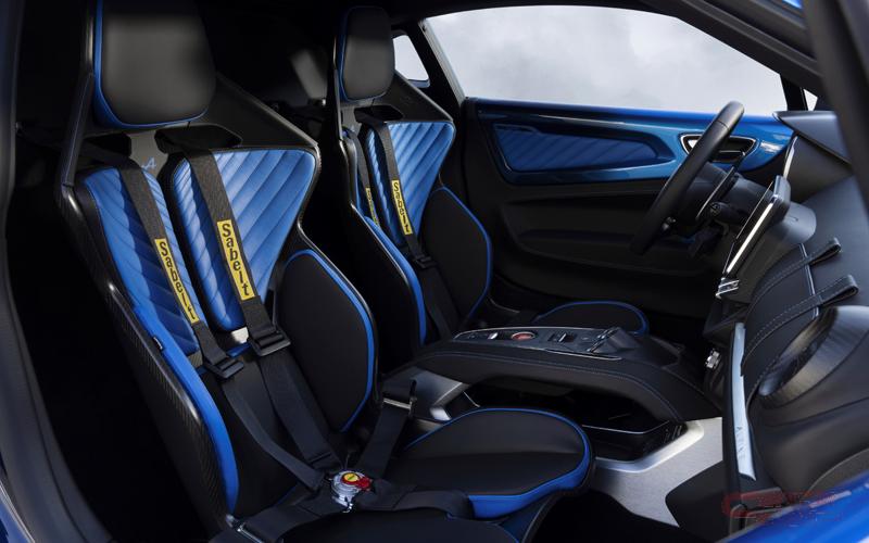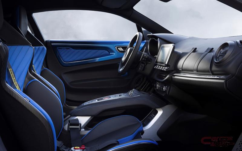 ボディにはアルピーヌを象徴する「ブルー アルピーヌ」と「ブルー アビス」が溶け合った特別なブルーがグラデーションでペイントされている他、内装にもPoltrona Frau®とSabelt®のデザインチームの手による特別なブルー レザーで統一されている。