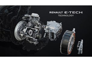 e-SMART HYBRIDは、エンジンで発電した電力を用いて、モーターを駆動させて走行するシリーズ方式を採用。発電専用の1.2リッターエンジンとモーターを組み合わせたシンプルな機構により、コンパクトサイズのクルマに適したハイブリッドシステムで、モーター駆動によるレスポンスの良い加速性能と高い静粛性を実現すると共に、発電と充放電を最適に制御することで、ガソリンエンジンモデルに対し燃費性能を向上した。