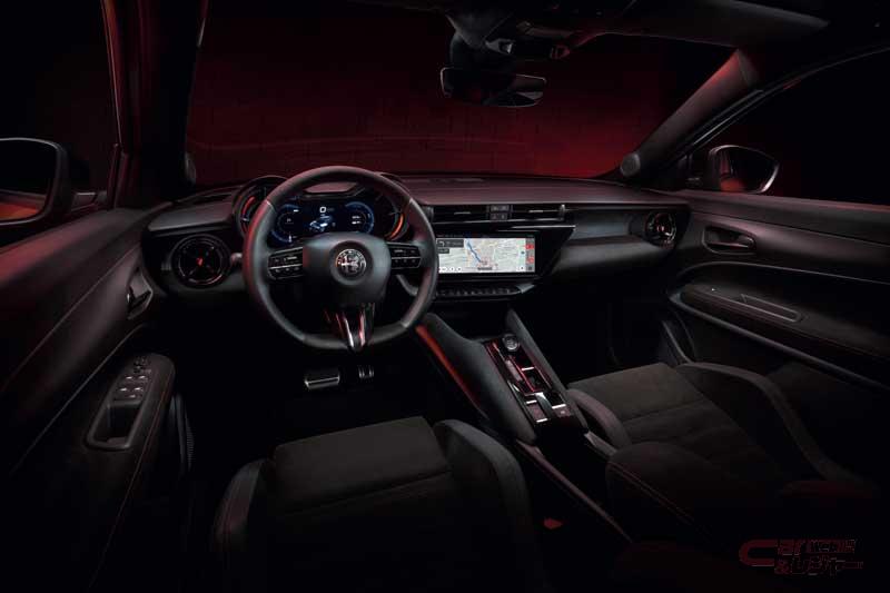 内装では、アルファ ロメオならではのドライバーを中心として設計されたコックピットを基盤に、最新技術を採用。すべてを直感的に行えるほどの素早い感知で操作できるようレイアウトされ、インストルメントパネルの計器類はレーシングカーのように奥まった位置に配置し、モータースポーツのDNAを感じさせながらも高い視認性を確保するテレスコープデザインを採用。中央にはホーム画面をドライバーの好みにカスタマイズ可能な10.25インチのタッチスクリーンを装備。