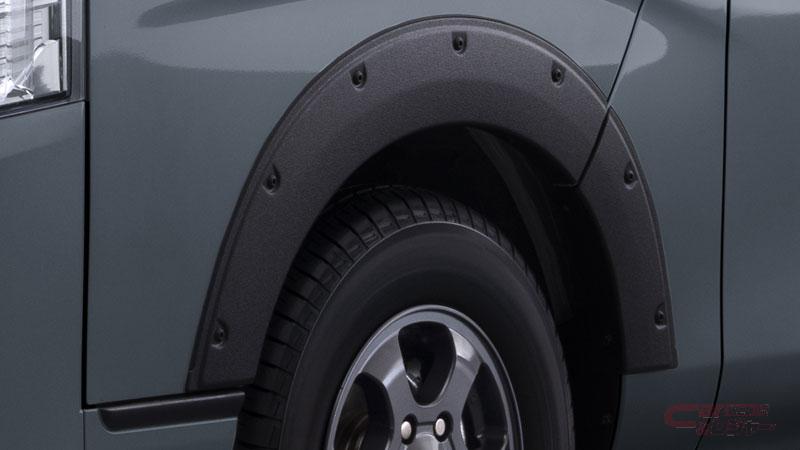 タフさと精密さを融合させ、耐衝撃性にも優れたJAOS製のフェンダーガーニッシュ。片側わずか10mm以内というタイトなサイズ感ながらも、緻密な造形とダミーボルトによりサイドビューへ無骨な存在感を与える他、意匠性の高い塗装がオフロードイメージを際立たせ、引き締まった印象を演出。
