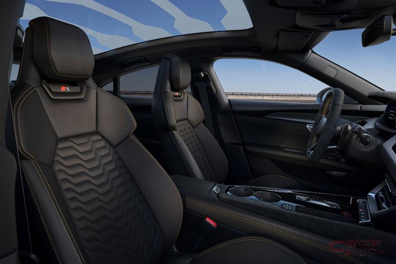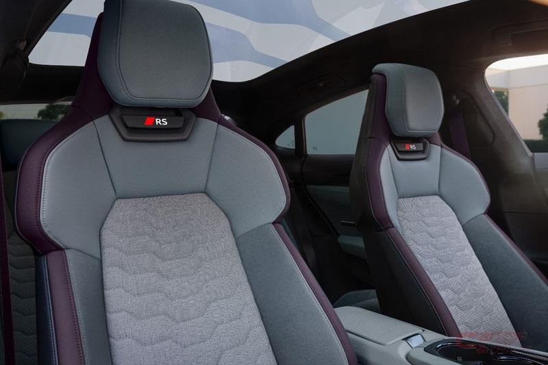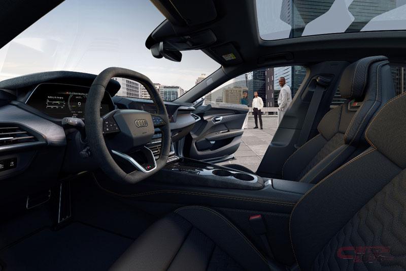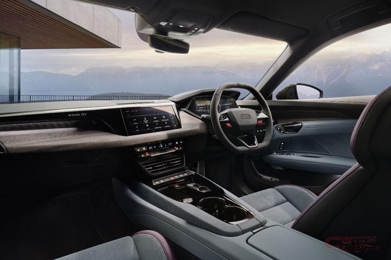 外装と同様に、内装にも新しいCIを反映。シート、ステアリングホイールシルプレート、デジタルコンテンツのデザインが見直され、ステアリングホイールの上下がフラット仕上げとなっており、12時の位置に配されたレッドのセンターマーキングは、RS e-tron GT performanceのみの仕様となる。