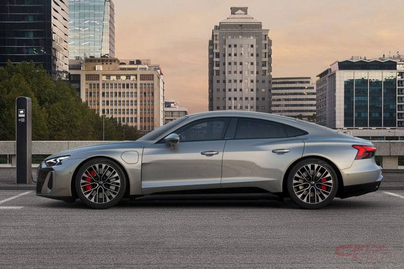グランツーリスモにふさわしいワイド&ローのプロポーションを実現。塊から削り出された彫刻のようなフォルムは、前後のquattroブリスターフェンダーにより力強さを強調。フロントマスクはボディ同色のシングルフレームグリルとそれを囲むブラックのマスクがe-tronモデルとしての個性を際立たせている他、新たなコーポレートアイデンティティ(CI)である2次元デザインのフォーリングスを採用するなど、最新のAudi Designにより、先進的な印象を演出。