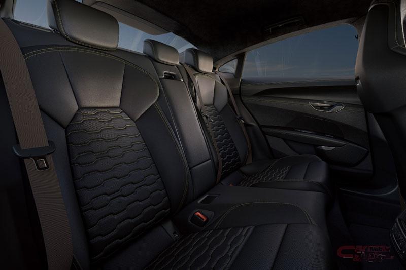 RS e-tron GT performanceには、ディープブラックのDinamica、バナジウムルックのデコラティブエレメンツを採用。天然繊維のようなファブリックのCascadeは、15%のセルビッチと35%のリサイクルされたポリエステルで作られており、環境保護の観点から染色はされておらず、シートやドアトリムに採用されている。