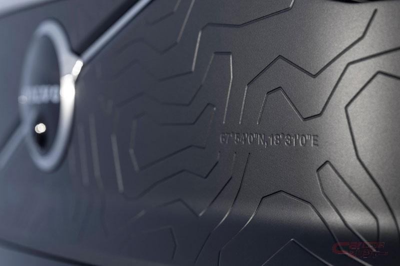 マットブラック仕上げが施されたフロントマスクとテールゲートを装備し、フロントにはEX30 クロスカントリーの冒険心を象徴し、スウェーデンの北極圏にあるケブネカイセ山脈の地形図からインスピレーションを受けたユニークなアートワークを採用。