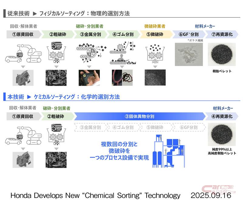 ホンダは9月16日、自動車廃材特有の固体異物を含有したELV(End-of-Life Vehicle:使用済み自動車)由来の廃プラスチック部品から、資源となるプラスチックを選別して抽出する、固体異物分離技術「ケミカルソーティング」を新たに開発と発表した。2026年中に最大処理能力350トン/年規模のパイロット設備の導入と実証を行い、2029年頃の実用化を目指す。