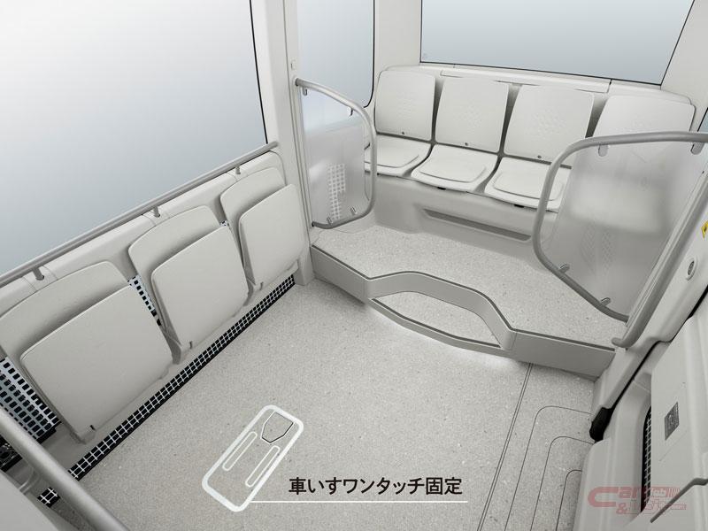 - 低床、大開口スライドドアにより、短時間での乗降が可能。車高調整機能により低床を実現し、電動スロープにより、歩道高さ15cmの場合車いすの方が介助なく自力で乗降することも可能な他、車いすのワンタッチ固定などのオプションも装着可能。