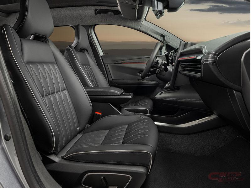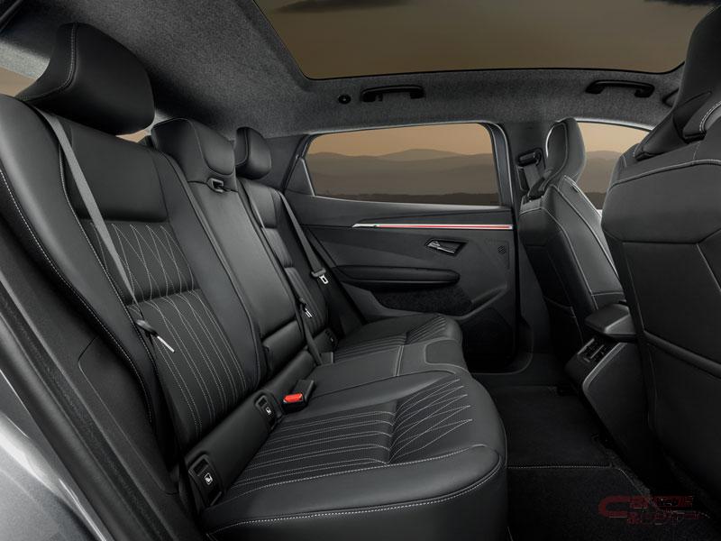 “スポーティ&モダン”をテーマに、車内を囲むように配されたサテンシルバーの水平基調のアクセントが、空間の広がりと先進性を演出。シートレイアウトは、広さと使い勝手にこだわった2列5名乗車で、ホールド性を高めたシートにはダイヤモンドパターンのステッチを採用し、上質感と快適性を実現。また、ドアパネルとダッシュボードに配したアンビエントライトがモダンで先進的な雰囲気を演出。
