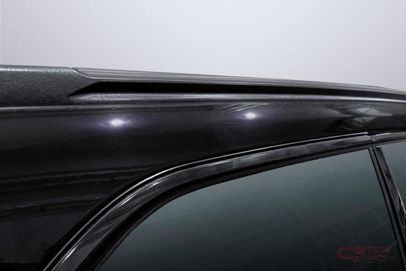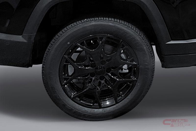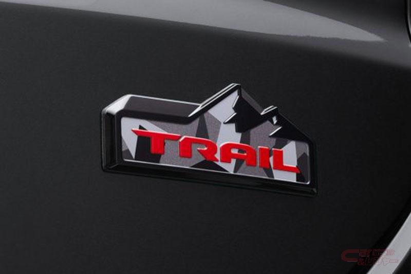 トレイル エディションは、既存色「ブリリアントブラッククリスタルP/C」の落ち着いたブラック&グレーを基調としたボディに、鮮やかなレッドのアクセントを施した限定車。特に、フロントフェイシア下部(フロントバンパー下部)に施されたレッドアクセントが特徴的な他、従来のクロームアクセント部位には限定車専用の「ニュートラルグレー」と「グロスブラック」を採用し、リアにはカモフラージュ柄にレッドの「TRAIL」文字が際立つ専用バッジを装着。