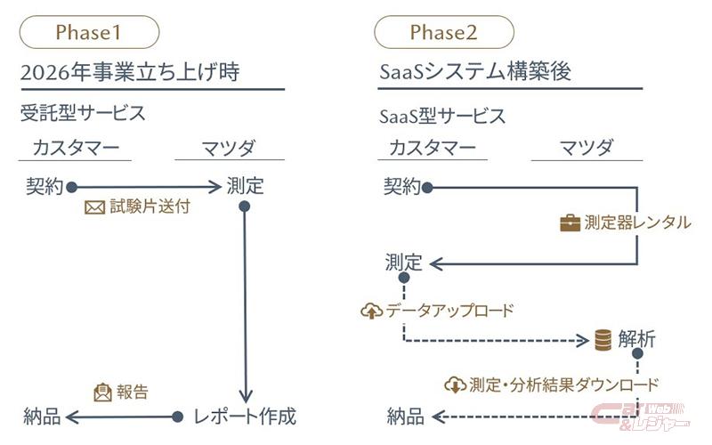現在、マツダは事業化に向けて、協力企業から提供を受けたサンプルを独自の診断技術で評価し、その結果を報告書として納品する受託型サービスの事業性検証を行っており、今後は2026年に受託型評価サービスとして事業化、および将来的にはクラウドを活用したSaaS型サービス(測定器で測定したデータがクラウドに自動転送され、クラウド上のソフトウエアで分析が行われ、その結果をPCなどのデバイスに提供するサービス)の提供を目指すとしている。