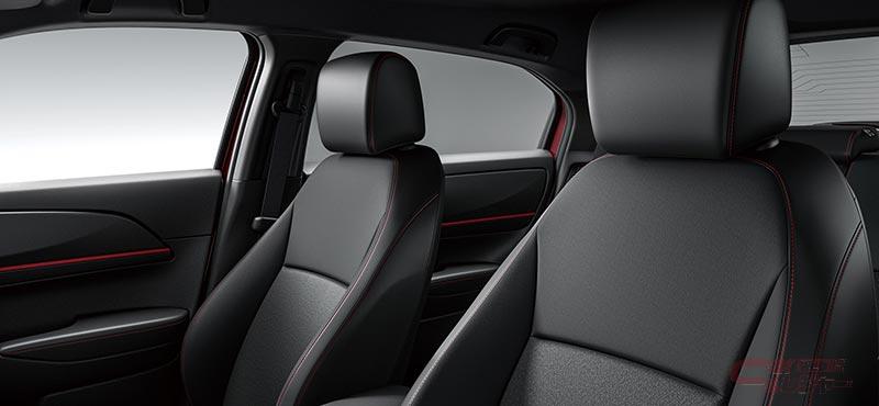 内装では、ブラックカラーを基調に、本革巻ステアリングホイールや、アームレストなど各所にレッドステッチを施し、インパネガーニッシュとドアライニングガーニッシュにはレッドカラーを採用するなど、レッドカラーのアクセントを採用することでスポーティな室内空間を演出。また、シート表皮には、上質かつ耐久性に優れたラックス スェード®を採用し、質感を向上した。