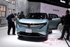 アリアは、洗練されたデザインと最新技術を兼ね備えた日産のフラッグシップEV。今回出展するモデルは、年度内のマイナーチェンジを予定しており、より先進性と上質感を感じるフロントデザインに一新するとともに、Googleを搭載したインフォテインメントシステムの採用や、EVのバッテリー電力を取り出すことができるV2L(Vehicle to Load)機能の追加、また日本の道路環境においてより快適な乗り心地を提供するサスペンションの変更などを施している。