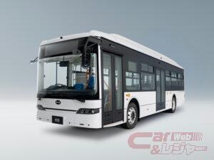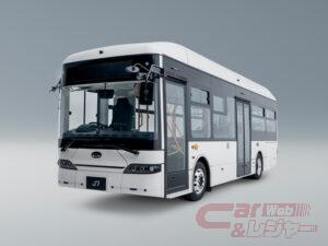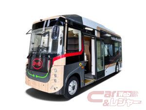 日本の道路環境に合わせて専用開発された中型EVバス。場では車内後部の段上げ仕様車を展示。