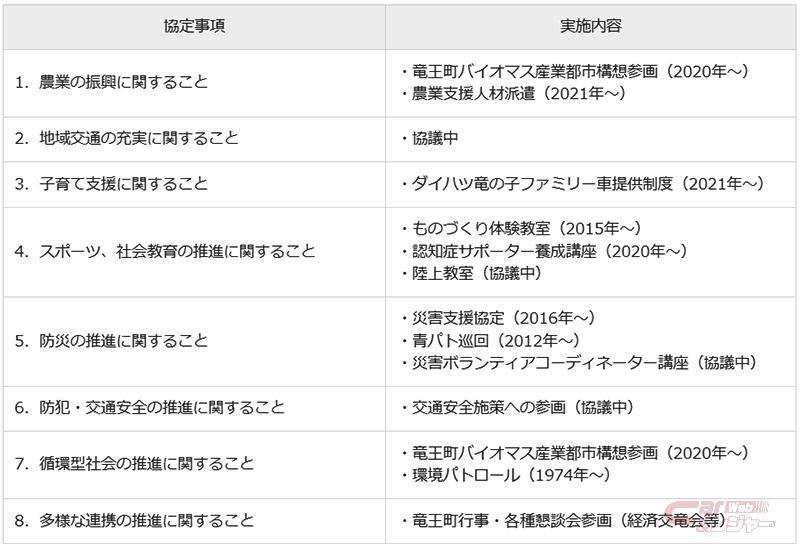 竜王町が今年町制70周年、ダイハツは昨年第1地区で開設50周年、第2地区で同35周年という節目を迎えたことを機に、両者の連携を一層強化するため、今回、包括連携協定を締結。同協定により、さらに幅広い分野での連携が可能となり、8つの協定事項について協働・共創の取組みを推進することにより、竜王町内の地域活性化および住民サービスの向上を図る。なお、ダイハツにとって生産拠点を置く自治体との包括連携協定は初となる。
