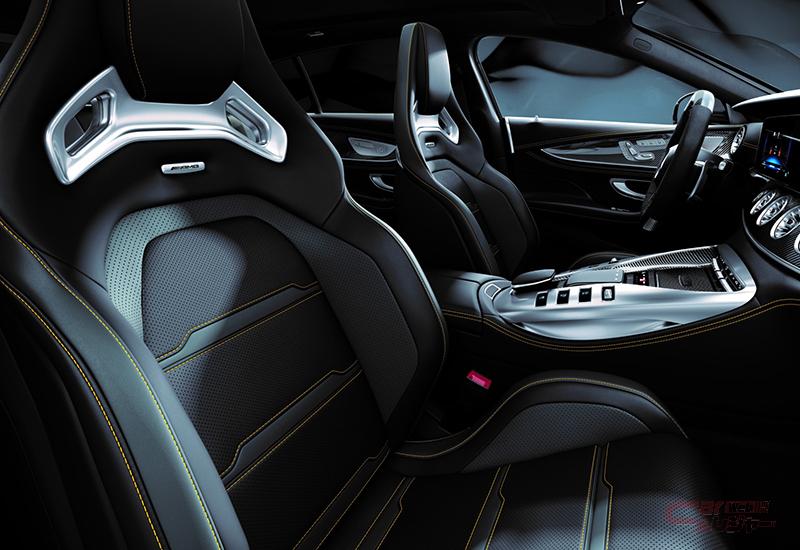ダークカラーに統一され、力強さとGTならではの圧倒的な存在感を同時に表現した。さらに、AMGカーボンエクステリアパッケージによりフロントスプリッター、サイドスカート、リアディフューザーがカーボン素材に変更され、圧巻のパフォーマンスを予感させる外観を演出。