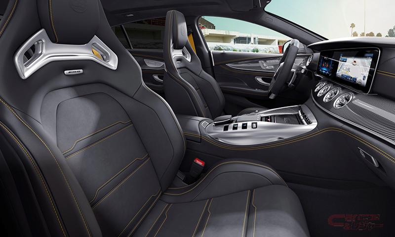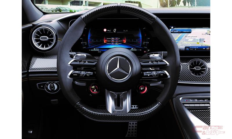 限定装備の「AMG パフォーマンスステアリング(カーボンファイバー/MICROCUT)」、「Final Edition」のバッジがあしらわれたセンターコンソールに加えて、通常モデルでは有償オプションの「フルレザー仕様(ナッパレザー/MICROCUT、ブラック(イエローステッチ入)」、「AMG パフォーマンスシート」、「イエローシートベルト」、Mercedes-AMG GT 63 S 4MATIC+では有償オプションの「AMGカーボンインテリアトリム」を標準装備。