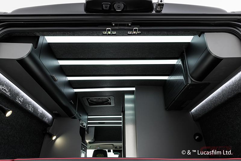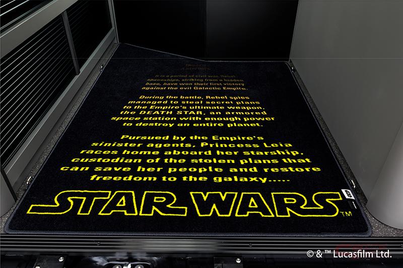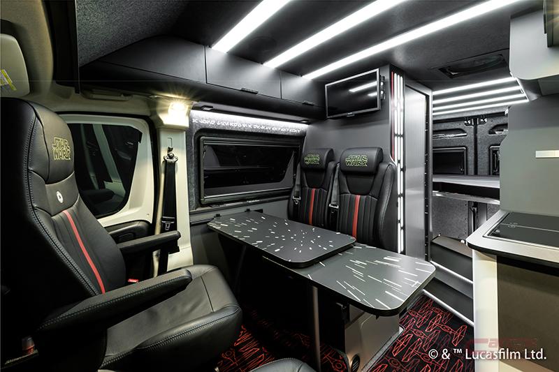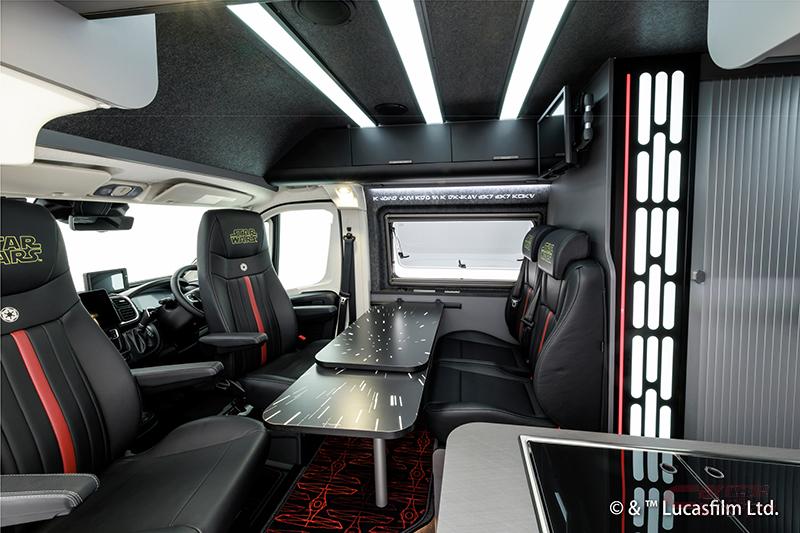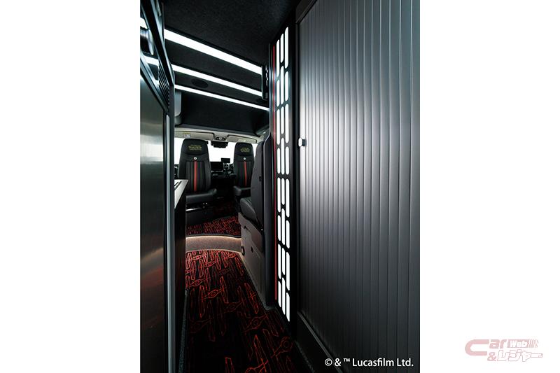 また、鮮烈な赤のラインをあしらった限定ブラックレザー、フロントシートの帝国軍シンボルとヘッドレストのSTAR WARSロゴが、ダース・ベイダーの威厳を想起。他にも、宇宙を高速移動するハイパードライブ時の象徴的な光の筋をデザインに採用したテーブル(ハイパードライブ )、帝国軍のダークなブラックと赤で彩られたキッチンスペース、漆黒に赤いパイピングが映えるベッドルーム、巨大戦闘基地デス・スターの管制室をイメージしてデザインしたスイッチパネル、帝国軍の主力戦闘機「タイ・ファイター」をモチーフにした赤い柄のフロアマット(タイ・ファイター)、伝説の始まりとなった映画「エピソード4:新たなる希望」のオープニングクレジットを採用したフロアマット、巨大な宇宙要塞デス・スターの緻密な内部構造をモチーフにした照明を配置するなど、各所に趣向を凝らした演出が施されている。