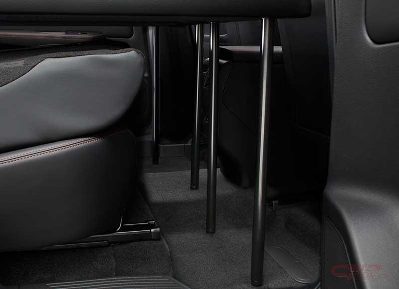 さらに、ROCK CREEKのシートと同様に、溶岩をイメージした「ラバレッド」のステッチをベッドマットにも施すなど、内装全体をトータルコーディネート。ベッド展開時にはベッド下に荷物を収納することもでき、車内での快適な休憩や宿泊のための機能を有しながら、積載性も兼ね備えた。