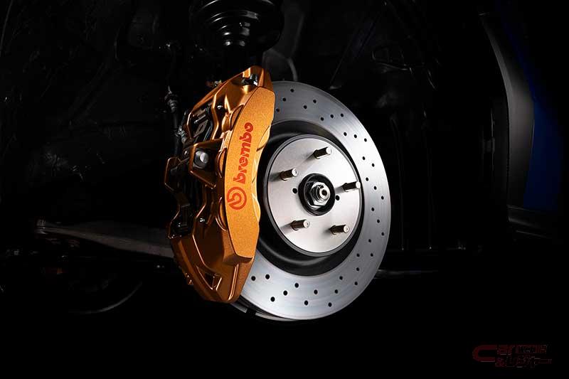 さらに、ブレーキにはゴールド塗装のbrembo製18インチフロント対向6ポット&リヤ対向2ポットブレーキキャリパーを採用し、制動力とコントロール性を向上した他、STIパフォーマンスパーツなどにより、ドライバーの意思がダイレクトに伝わる操作感と、スバルならではの走りの愉しさを実現した。