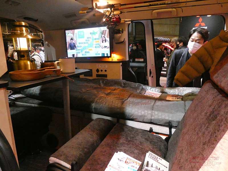 今回三菱ブースに出展された「デリカD:5 アクティブキャンパー LOGOS エディション」は、キャンピングカーメーカー「ダイレクトカーズ」とアウトドアブランドの「LOGOS(ロゴス)」のコラボレーションにより誕生したモデル。