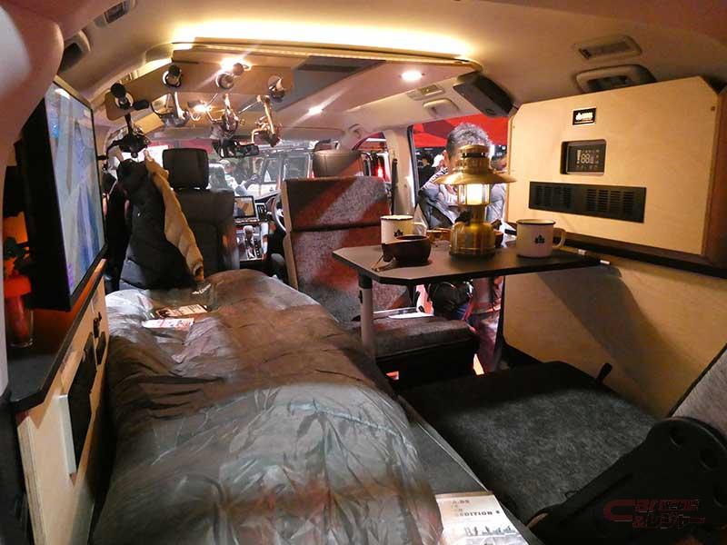 また、セカンドシングルシート、サードシングルシートは乗車時には前向きで、ベッドモードではフルフラットに展開でき、自由自在なシート展開が可能となっている他、DC12Vクーラーも標準装備。車体色はホワイトダイヤモンド/ブラックマイカ。