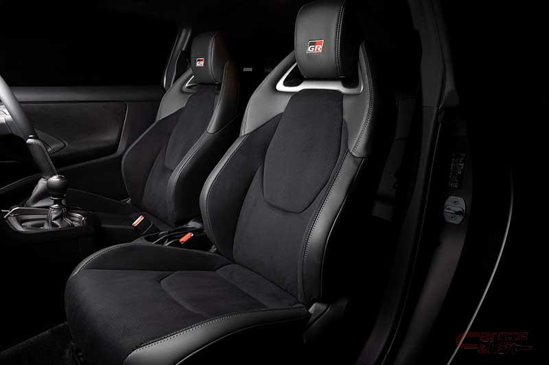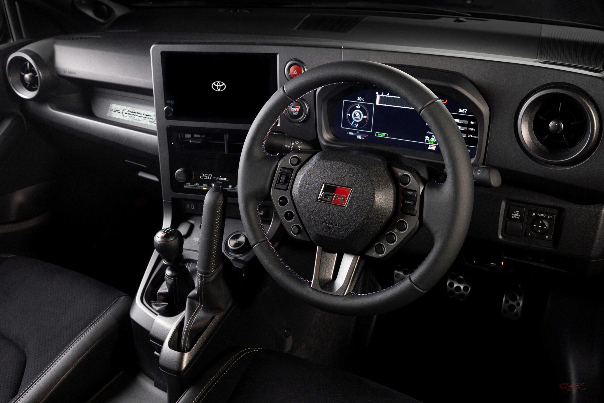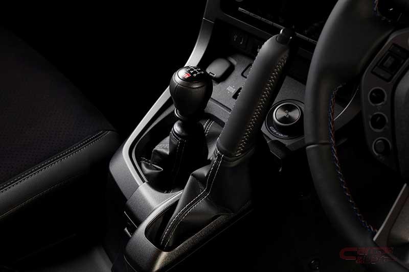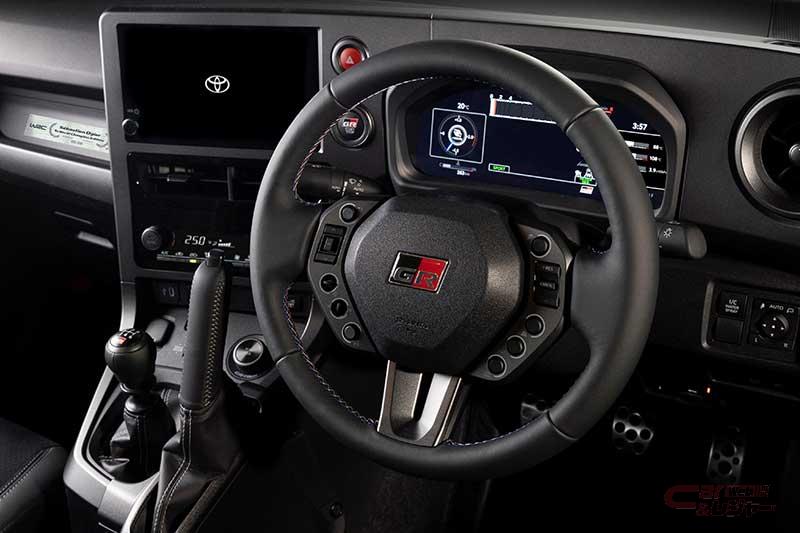 内装では、モータースポーツにおける操作性を追求して開発したステアリングホイールを装備。外形をひとまわり小径化し、ステアリングスイッチの形状を変更した他、ステアリングスイッチはラリーからの学びを得て、各種スイッチが独立した形状とした。ステッチにはブルー、グレー、レッドの3色(トリコロール)を採用。