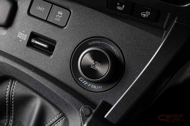 また、ベース車の「GRAVEL」モードと置き換える形で「MORIZO」モードを装備。トラクション性能と旋回性能を高い次元で両立させるため、加速時は前後輪の拘束力を最大(直結)とし、制動時は必要分だけ拘束を緩める四駆制御モードで、モリゾウこと豊田章男会長がラリーで走り込んで導き出した駆動力配分をオジエ選手が気に入り採用に至った。